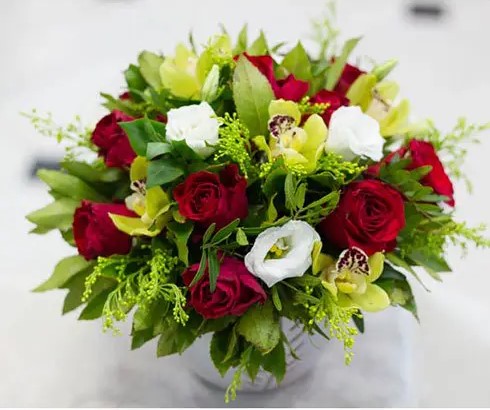 تشكيلة جميلة في وعاء أنيق تضم زهورًا حمراء وبيضاء مكملة بأوراق خضراء نضرة، لتخلق عرضًا منعشًا، نابضًا بالحياة، وأنيقًا، مثالي لديكور المنزل أو كهدية مدروسة.