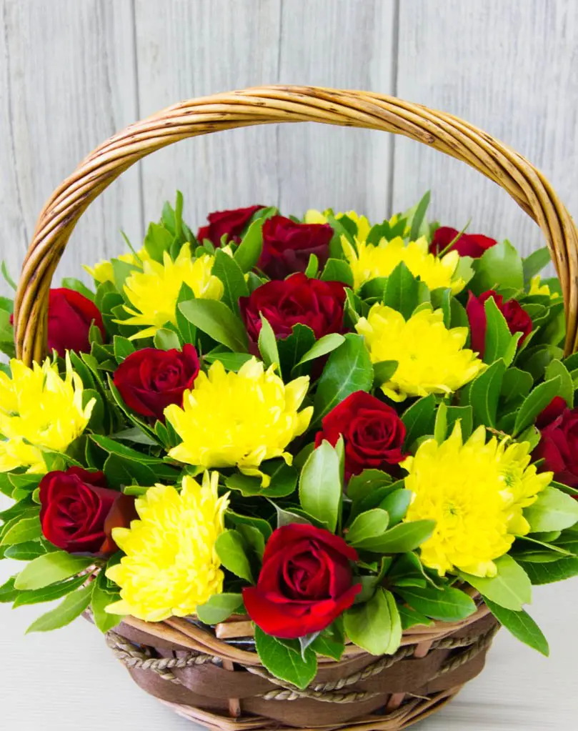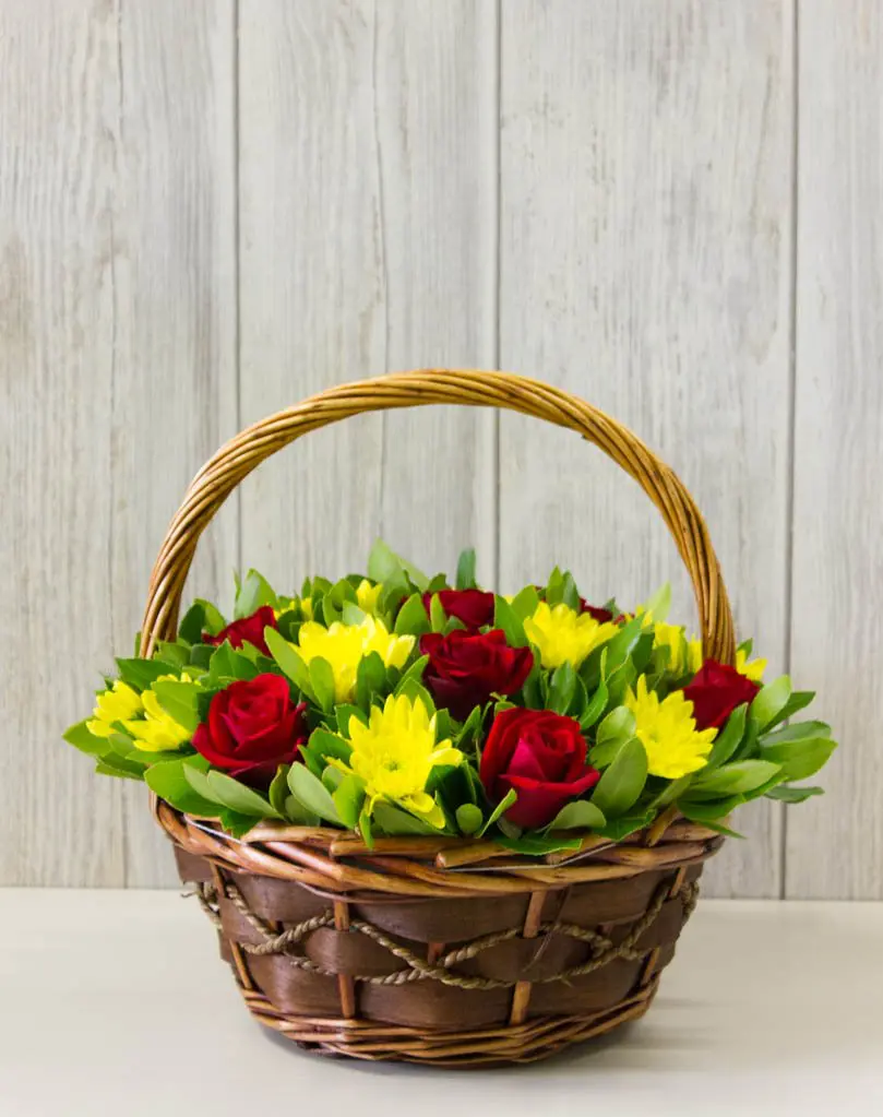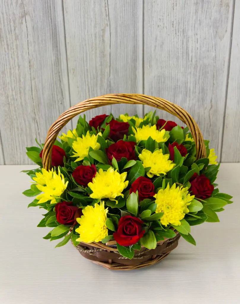 A vibrant basket featuring a stunning mix of red and yellow flowers, bringing warmth, energy, and elegance to any space, perfect for home or office decor and as a thoughtful gift for flower lovers. Sizes: Standard up to 20 Roses Deluxe up to 30 Roses Premium up to 40 Roses.