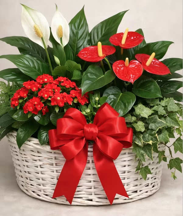 A stunning basket featuring anthurium and peace lily paired with blooming plants. This elegant blend adds freshness, color, and a calming natural touch. Perfect for gifting or creating a serene and vibrant atmosphere.