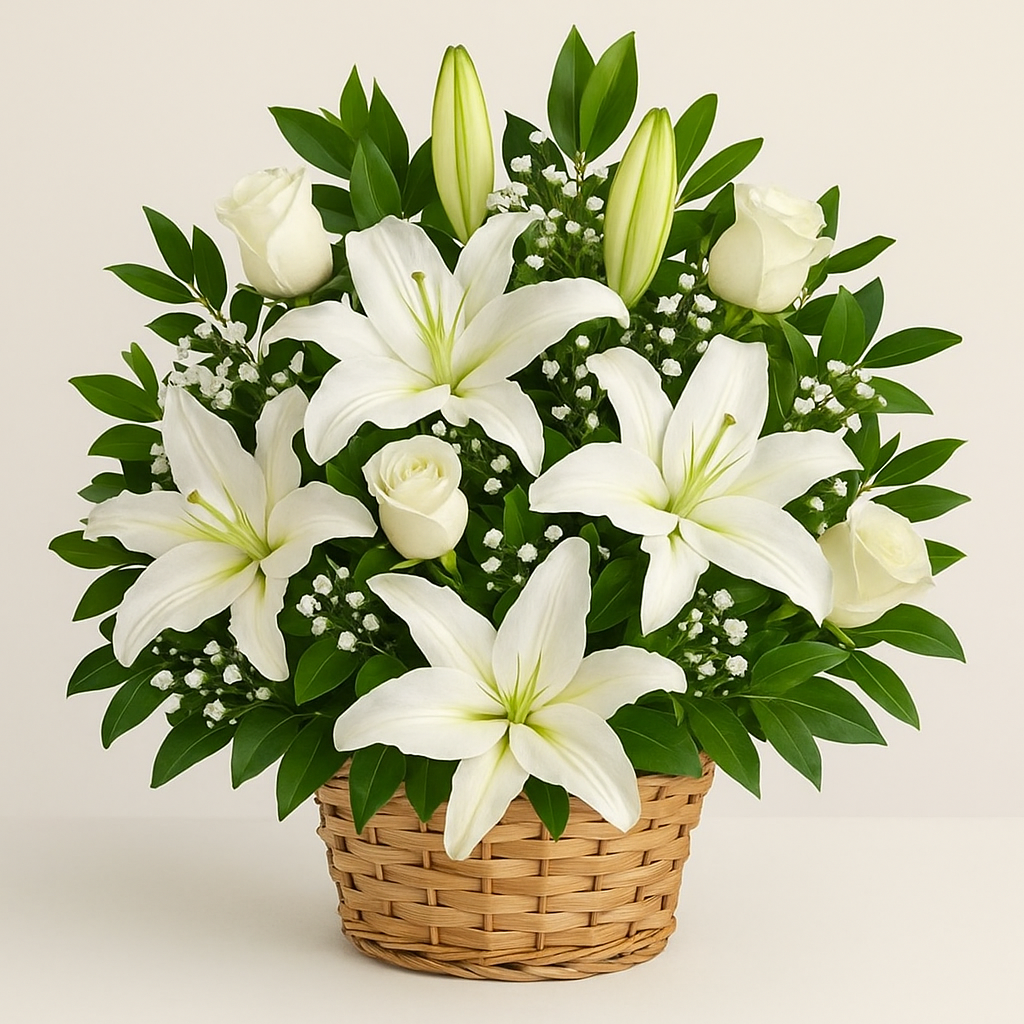 A graceful basket featuring a refined mix of white lilies and roses, symbolizing purity, serenity, and timeless beauty. Perfect for heartfelt occasions, sympathy gestures, or to add a touch of elegance to any space.