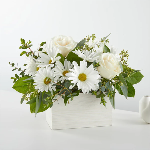 A beautiful wooden box filled with an elegant selection of white flowers, creating a serene and sophisticated display that adds purity and charm to any space, perfect for gifting or decorating your home or office. Sizes: 20 Roses